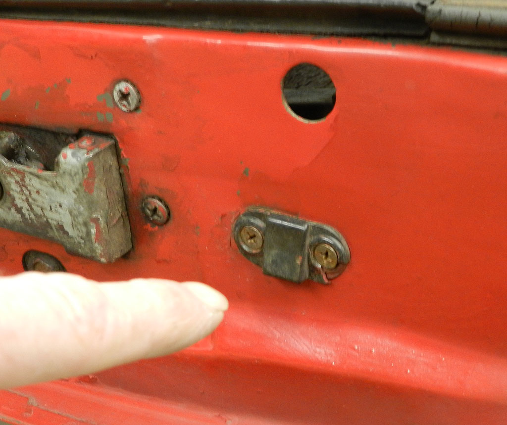 Terrible winter weather February 7th, 2026. Minus 2 degrees with snow and wind, drifting roads, windchill minus 20. Comparing the old and new door I see I need to remove the new door because the hole for the wire loom can't be cut with the door in place. It was now easy to cut the hole and reinstall the grommet. Convertibles have a second set of latches for alignment. I found the indents for the latch on the new door and installed the pieces. The door went back