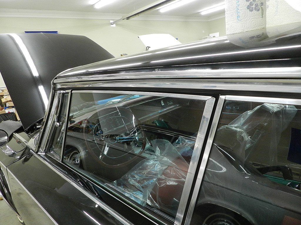 The roof rail gaskets and the quarter window gasket were replaced. Quirey has the new pieces. Removal of the roof rail gasket is easy. Except for the forward pieces by the vent window, the gasket is not glued and the old gasket pulls out of the retainer. Same for the quarter window vertical gasket. Be prepared to adjust your front window glass; the new gaskets are bigger and will cause the glass to tilt out. Adjusting the top stops should take most of the problem away. I adjusted both top stops to be a little lower and set the rear stop again a little lower. This gives the glass a little rearward tilt which helps close any gap between the front and quarter windows. We have a video here.